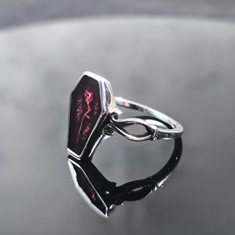 This ring feels carved straight from her realm — a crimson rose sealed inside a coffin-shaped black stone, equal parts elegant and ominous.